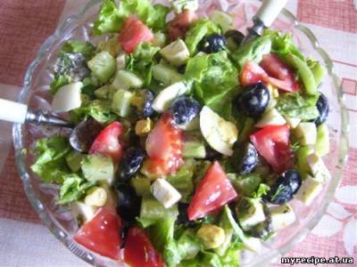 Салат "Оливковий" ( салата, оливки,огірки, помідори, варені яйця,сир "Фета" - все крупно порізати. Залити олія оливкова+сік лимона+часник, кріп)